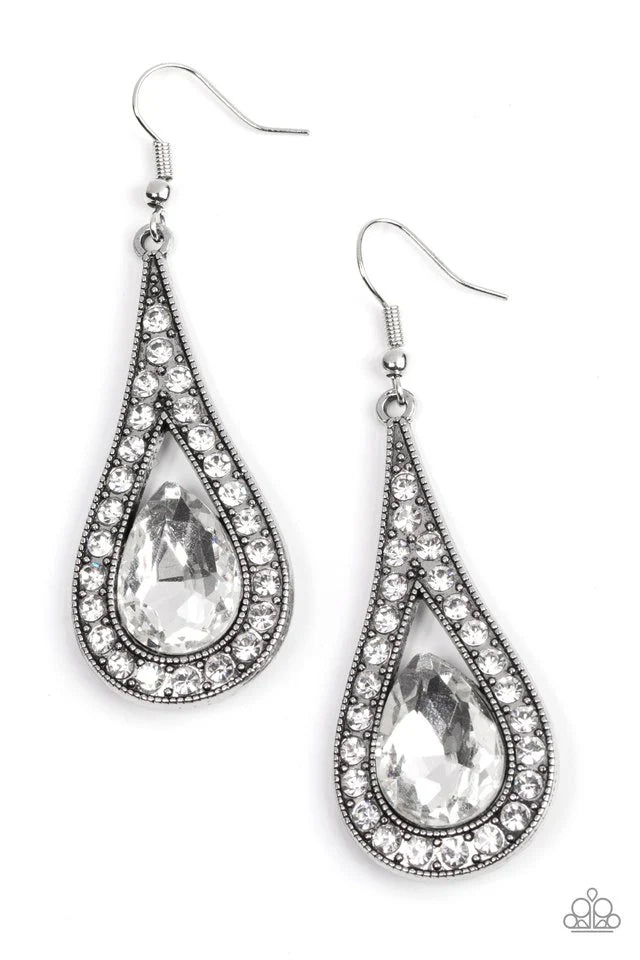 An oversized white teardrop gem is nestled inside the bottom of a ribbon of glittery white rhinestones, creating a dramatic lure. Earring attaches to a standard fishhook fitting.