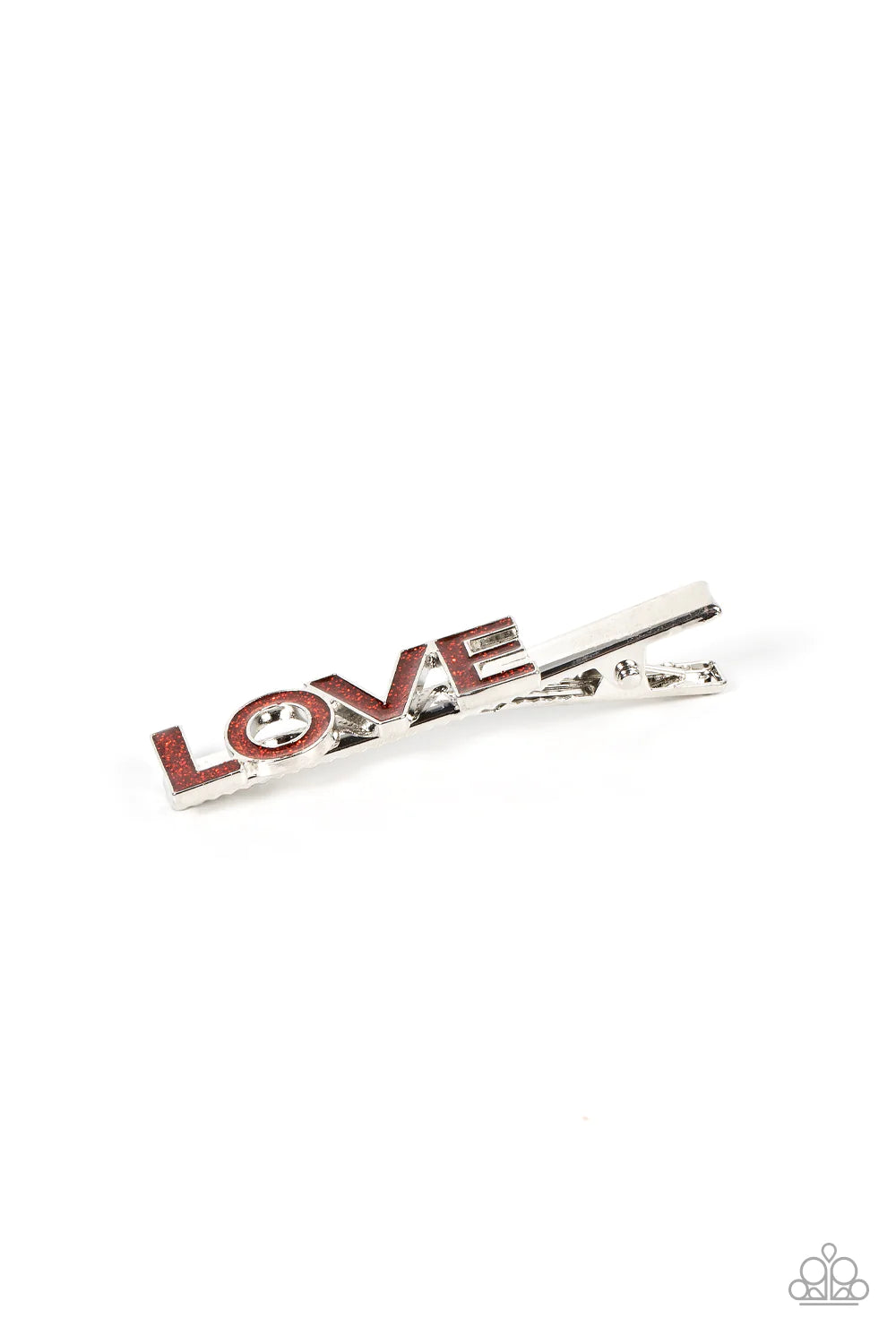 Featuring a glittery red finish, the word, "Love," is spelled across the front of a pair of silver hair clips for a colorfully charming look. Features standard hair clips on the back.
