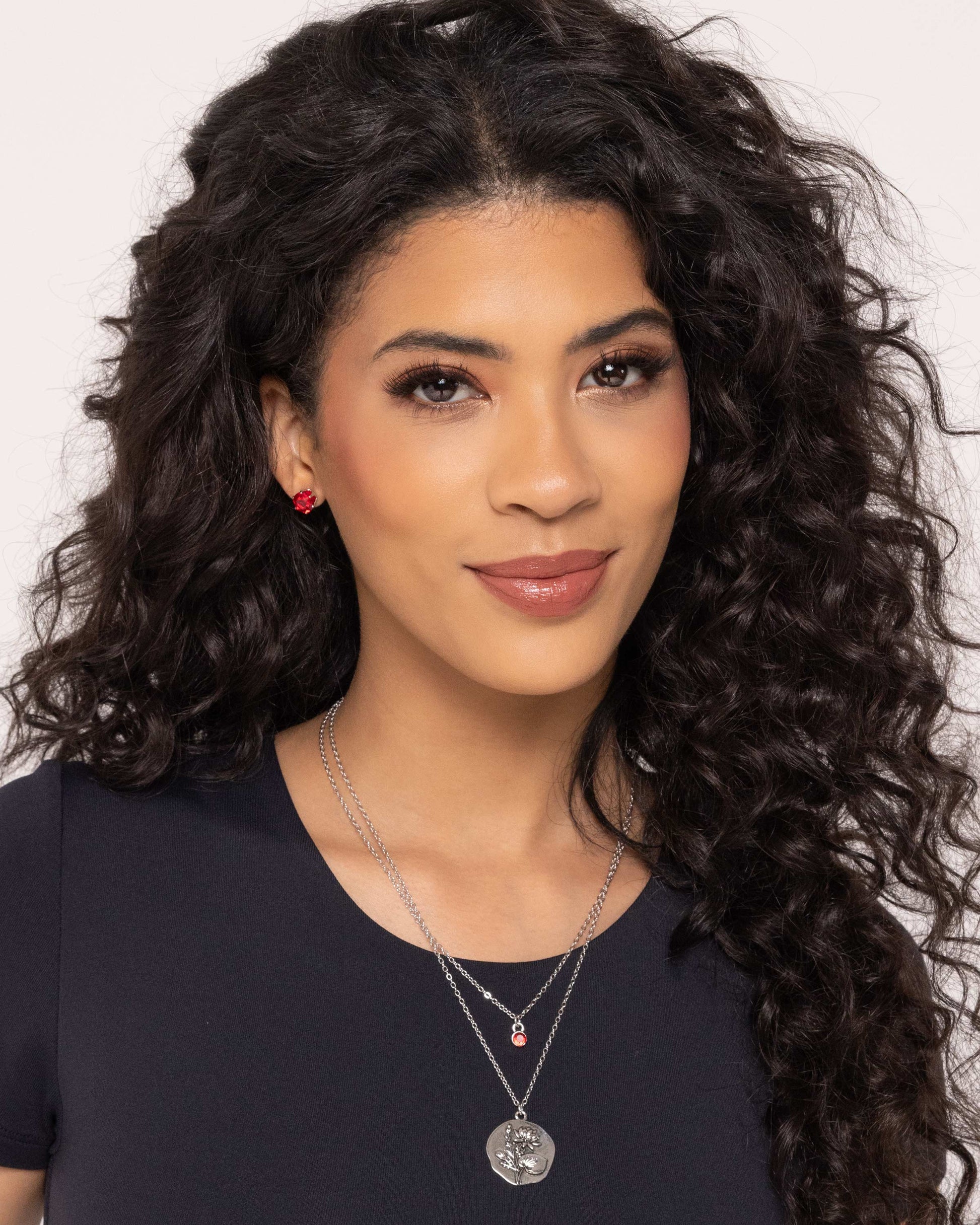A sparkling ruby rhinestone is nestled inside a classic silver frame for a beautiful birthstone-inspired display. Earring attaches to a standard post fitting.
