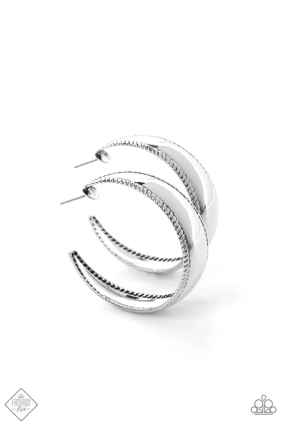 A wide smooth silver bar bordered in rope-like texture curls into a simple hoop earring, resulting in a high-sheen statement piece designed to dazzle. Earring attaches to a standard post fitting. Hoop measures approximately 1 1/2" in diameter.