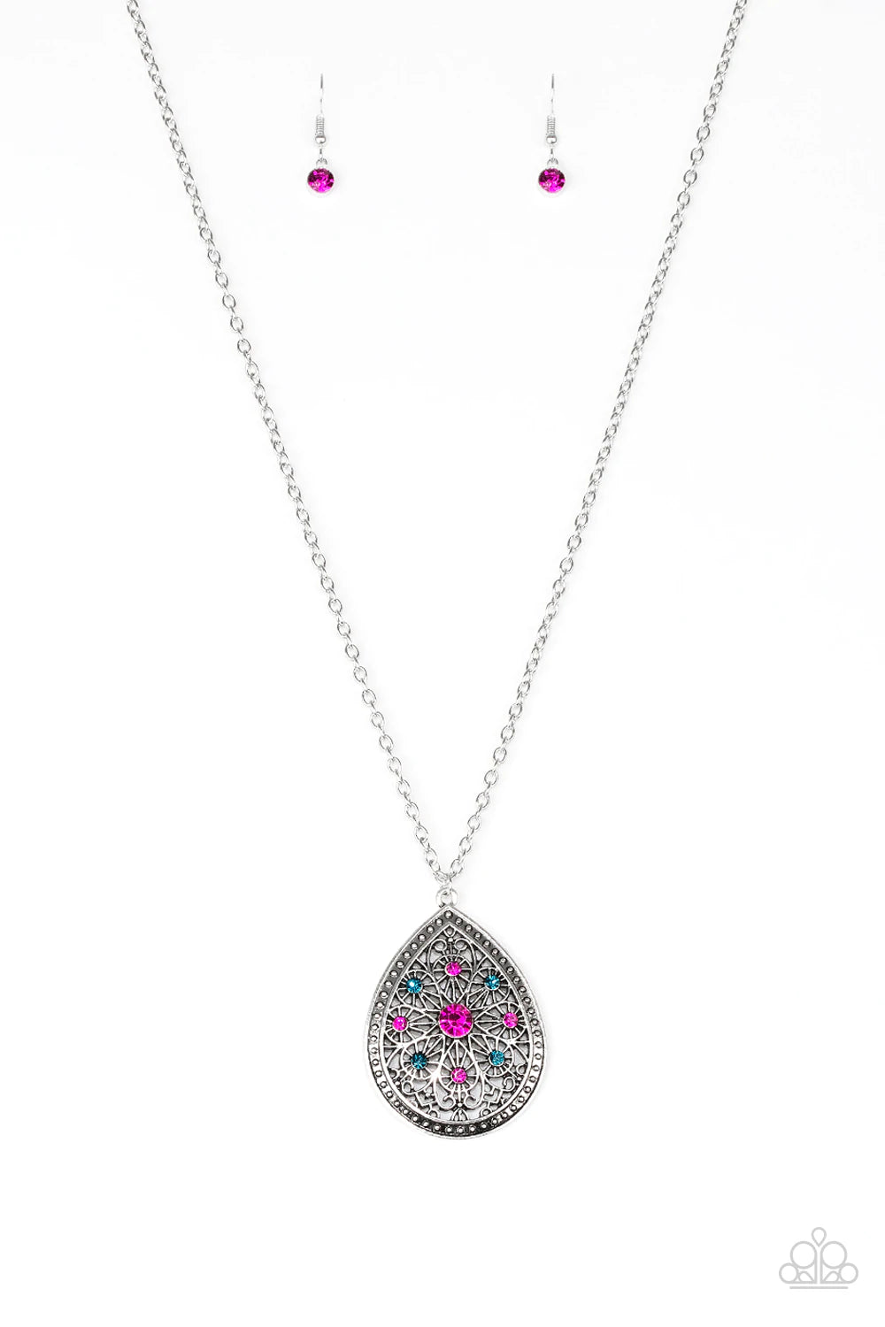 A dramatic teardrop pendant swings from the bottom of an elongated silver chain, elegantly slimming the torso. Glittery blue and pink rhinestones are sprinkled along the pendant as silver filigree dances across the center, creating a regal floral pattern. Features an adjustable clasp closure.