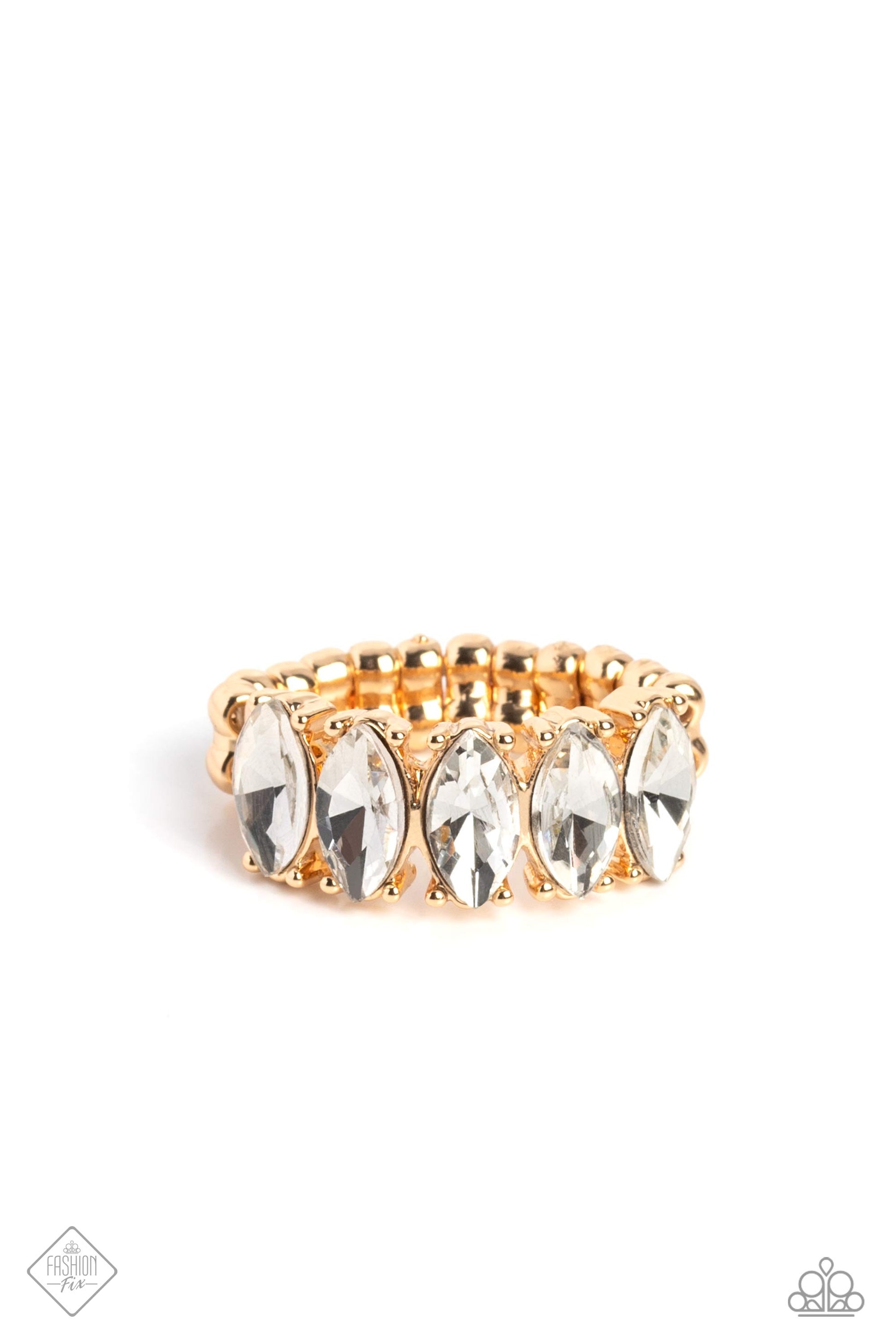 Exaggerated white marquise-cut gems are set atop pronged gold fittings, that arc across the finger in a linear pattern for a scintillating shimmer. Features a stretchy band for a flexible fit.