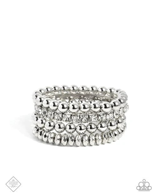 Infused along elastic stretchy bands, a quartet of high-sheen round and textured silver beads joins exaggeratedly faceted white gems in silver-pronged fittings for an elegantly edgy stack.