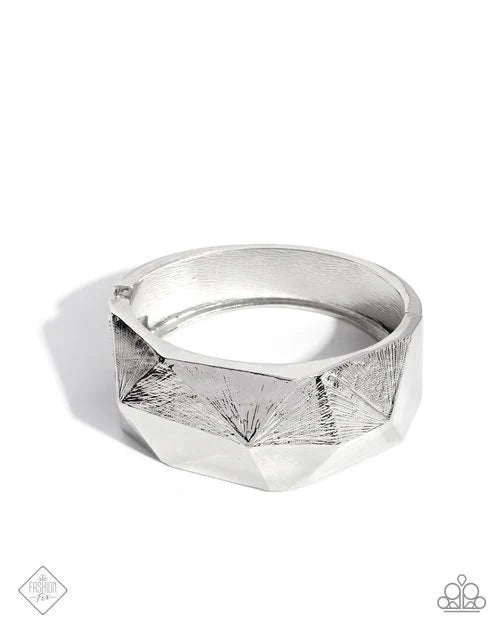 Featuring a high sheen, tactile textured silver comes to a point along the curve around the wrist for a daring and dauntless combo. Features a hinged closure.