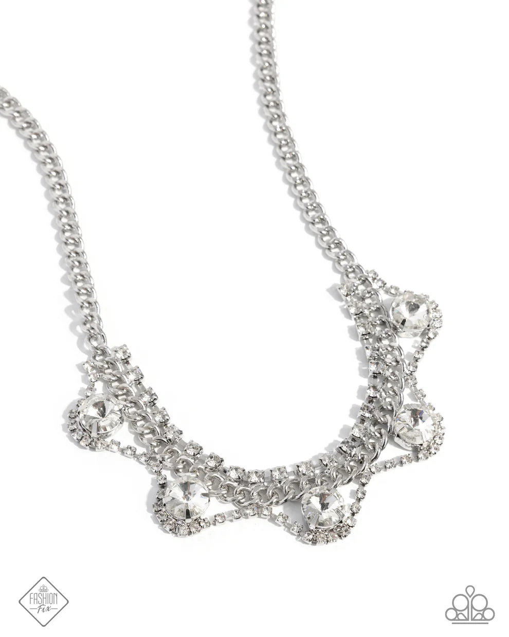 A silver curb chain drapes elegantly along the neckline, adorned with oversized, over-the-top faceted, silver-pronged white gems that are encircled and layered by smaller glittering rhinestones in silver square fittings for a luxurious, glamorous display. Features an adjustable clasp closure.