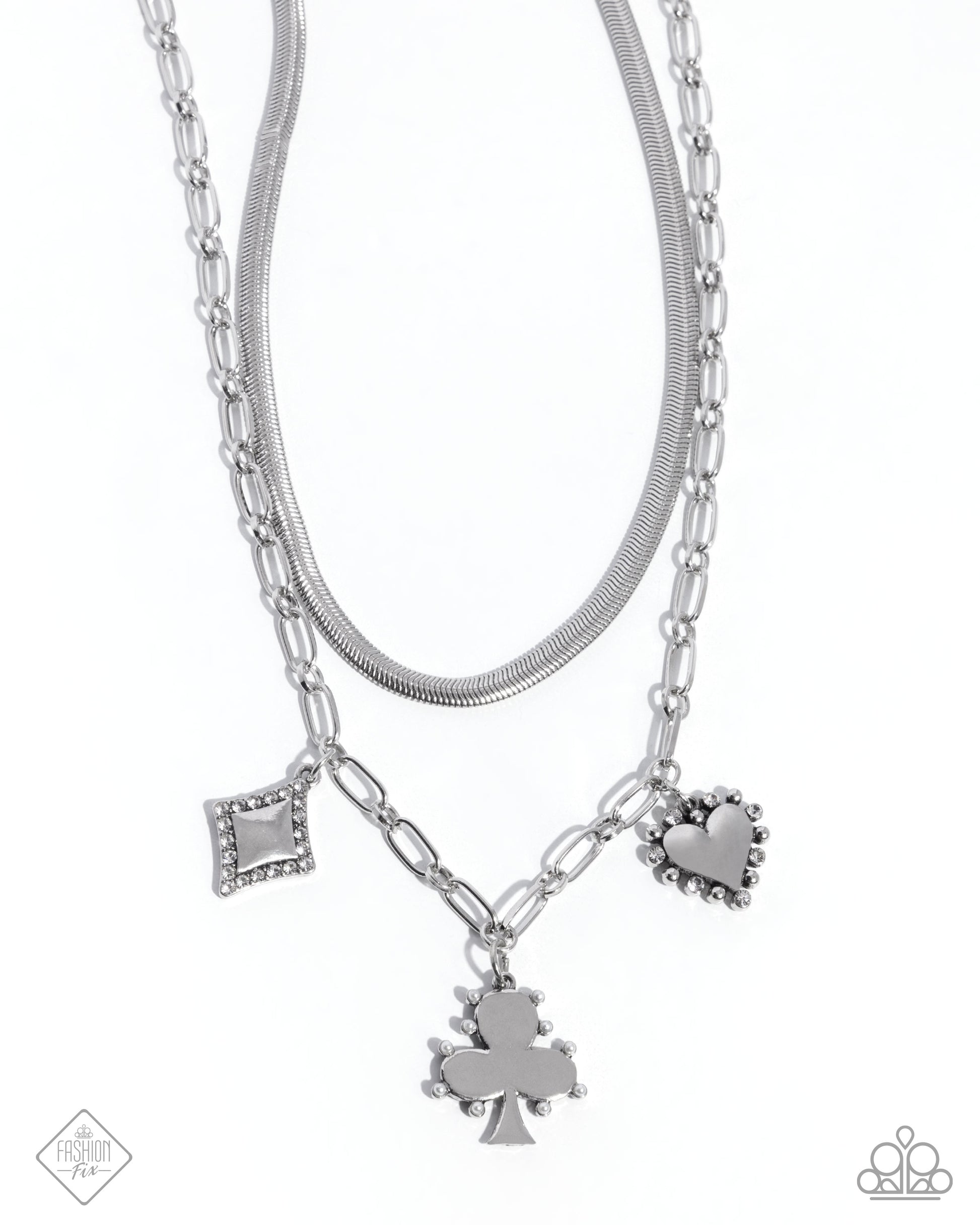 A flat, silver snake chain is suspended above a silver paperclip chain, layering into a dynamic lineup of high-sheen grit. A white stud and white rhinestone-bordered heart pendant, white rhinestone-bordered diamond-shaped pendant, and white pearl-bordered club pendant sway along the silver paperclip chain for a serendipitously sentimental statement. Features an adjustable clasp closure.