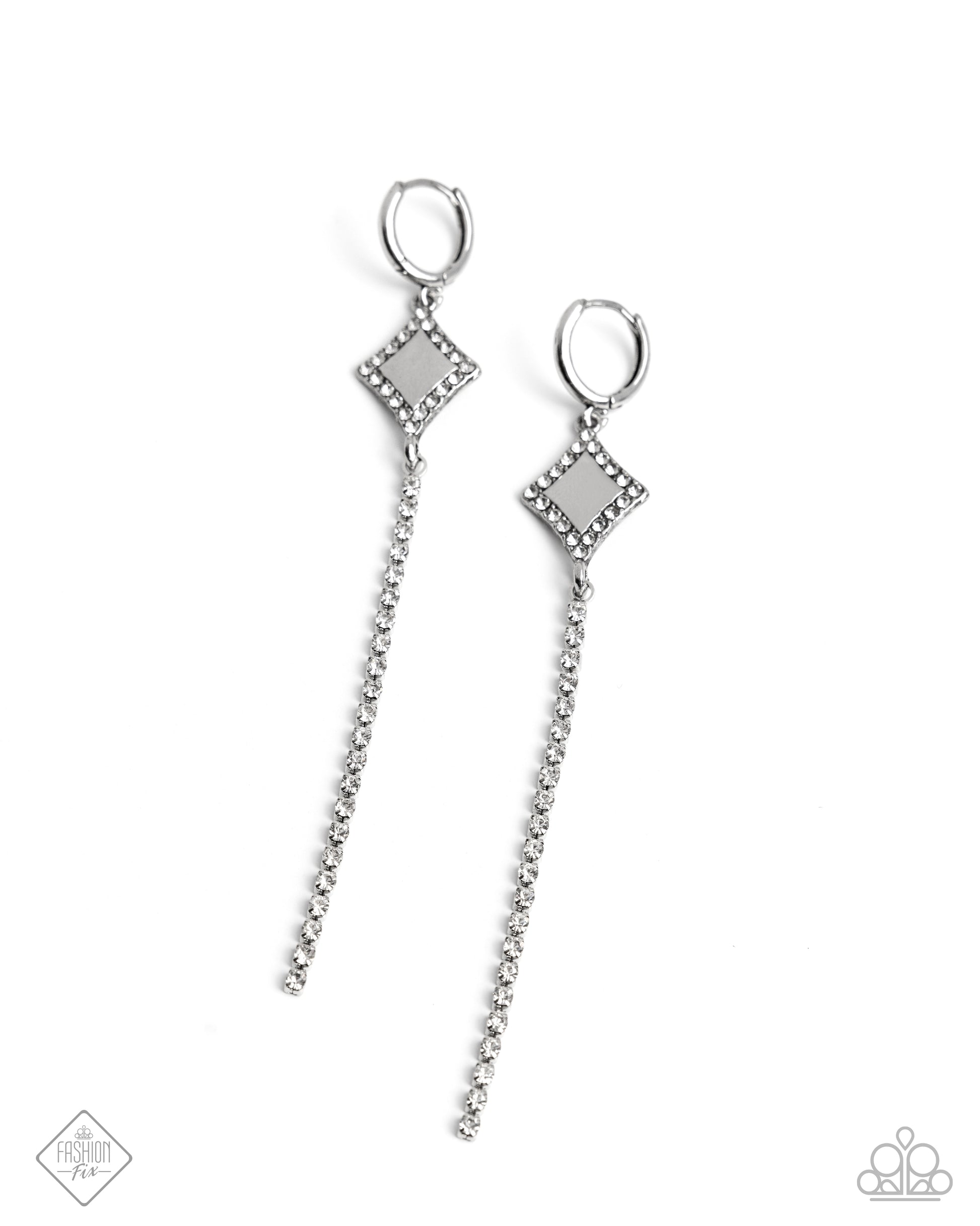 Featuring very distinct directions, silver diamond-shaped pendants pressed in white rhinestone borders give way to a row of glittery white rhinestones, hugging close to the ear for a glamorously glitzy fringe. Earring attaches to a standard hinge closure fitting. Hoop measures approximately 1/2" in diameter.
