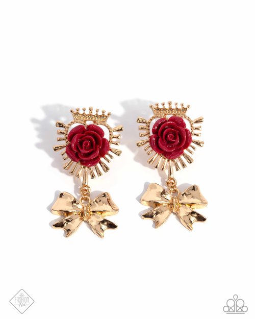Blooming atop a gold, royal crown-inspired, airy coat of arms, a wine acrylic rosette glistens from the ear, giving way to a high-sheen gold bow that sways below the ear for a fashionably formal look. Earring attaches to a standard post fitting.