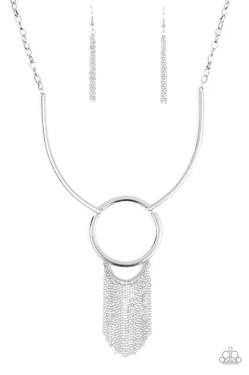 Attached to two bowing silver bars, a shiny silver hoop gives way to a shimmery silver chain fringe, creating a statement making look below the collar. Features an adjustable clasp closure.