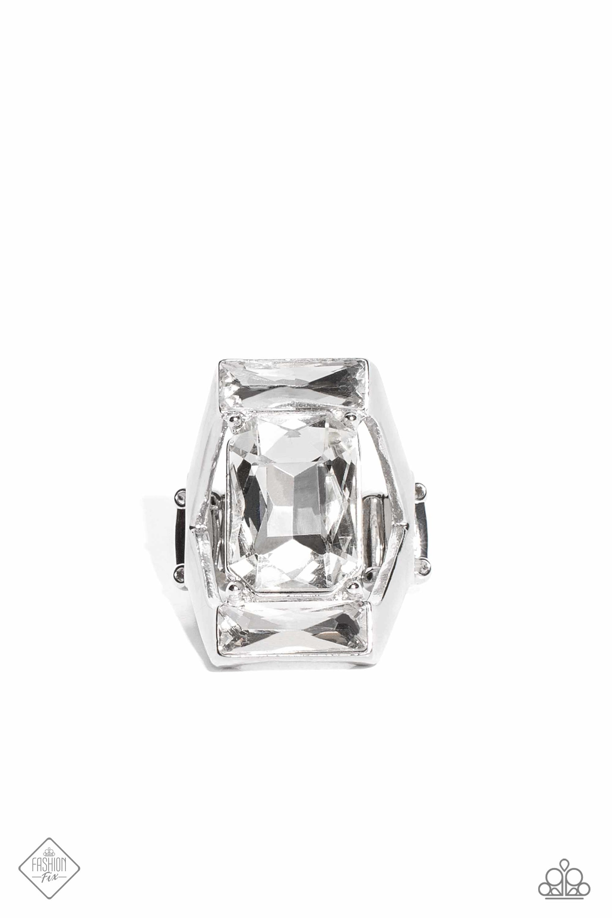 An exaggerated, oversized, rectangular frame encases a large, white, emerald-cut gem, showcasing its scintillating shimmer. Skinny white gems chiseled into rectangular bars are pressed into the top and bottom of the industrial frame, resulting in an unapologetic statement piece with unmatched sparkle. Features a stretchy band for a flexible fit.