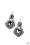 A hematite teardrop gem is pressed into a flared silver frame swirled in intricate patterns. The flared frame swings below a smaller hematite teardrop that is wrapped in a border of silver studs, creating a swinging statement. Earring attaches to a standard fishhook fitting.