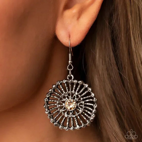 Hammered silver spokes flare out from a golden topaz rhinestone center, resulting in a studded silver frame. Earring attaches to a standard fishhook fitting. Sold as one pair of earrings.