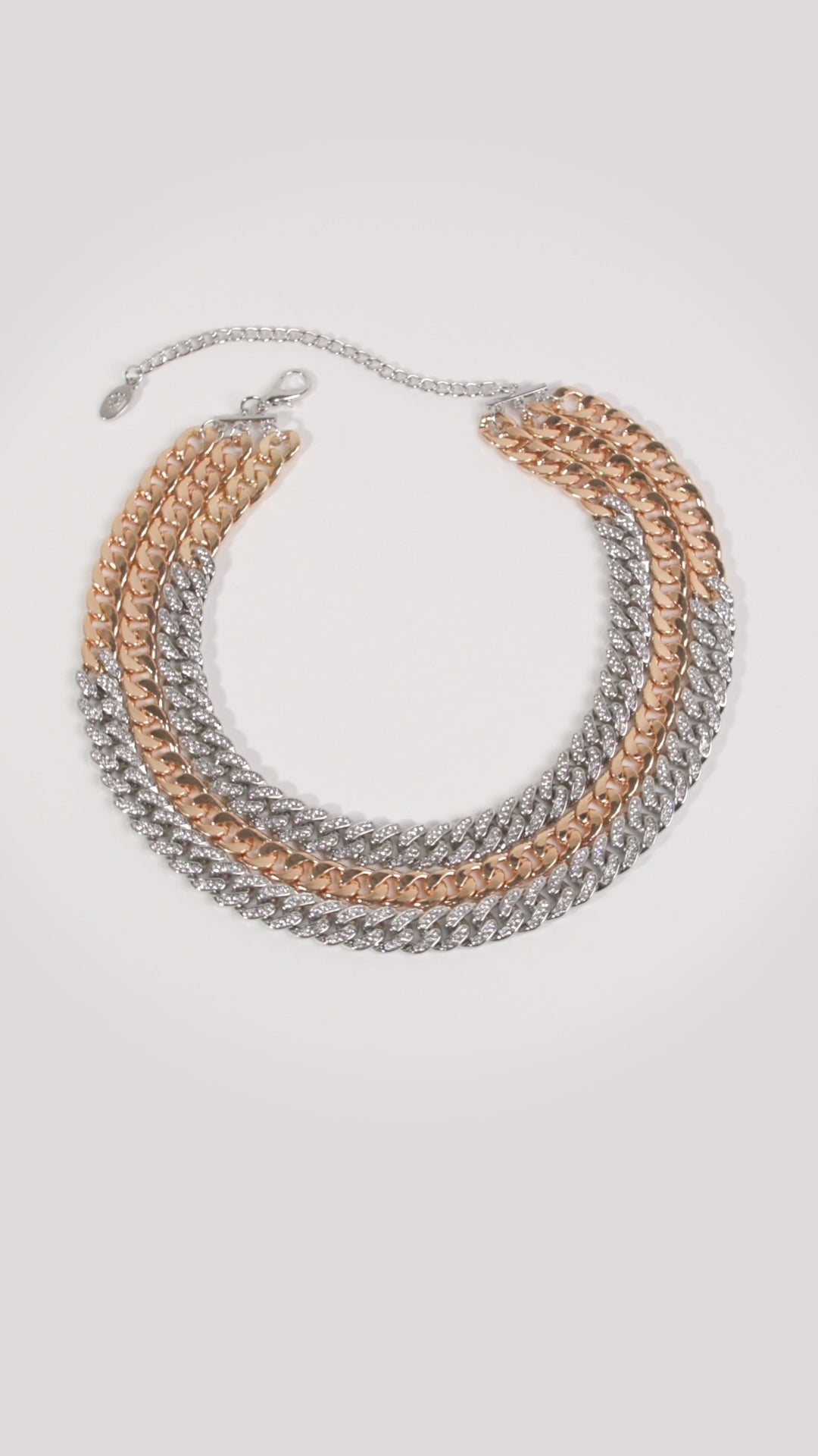A mismatched collection of sleek gold curb chains is layered with silver curb chains to create luminous layers with charismatic chaos. Faceted white rhinestones are sprinkled along the silver chains, adding dramatic flashes of glitz among the mashup of textures. Features an adjustable clasp closure.